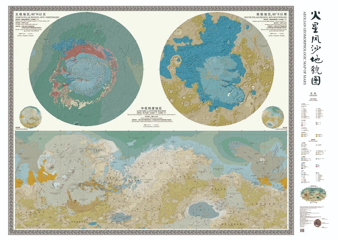 《火星风沙地貌图》由南极 、北极、中低纬度地区三部分组成,绘图范围基本覆盖了火星全球。专题内容包含了不同类型的地理单元、风积地貌和风蚀地貌等。借鉴地球风沙地貌分类,兼顾火星风沙地貌的特征,在全面详细地考察火星风沙地貌的基础上,对火星风积地貌和风蚀地貌进行了分类。该地图的出版填补了我国火星专题图出版的空白,为中国火星科学研究和比较行星研究提供了重要的基础资料,为中国火星风沙地貌学研究的发展奠定了坚实的基础。