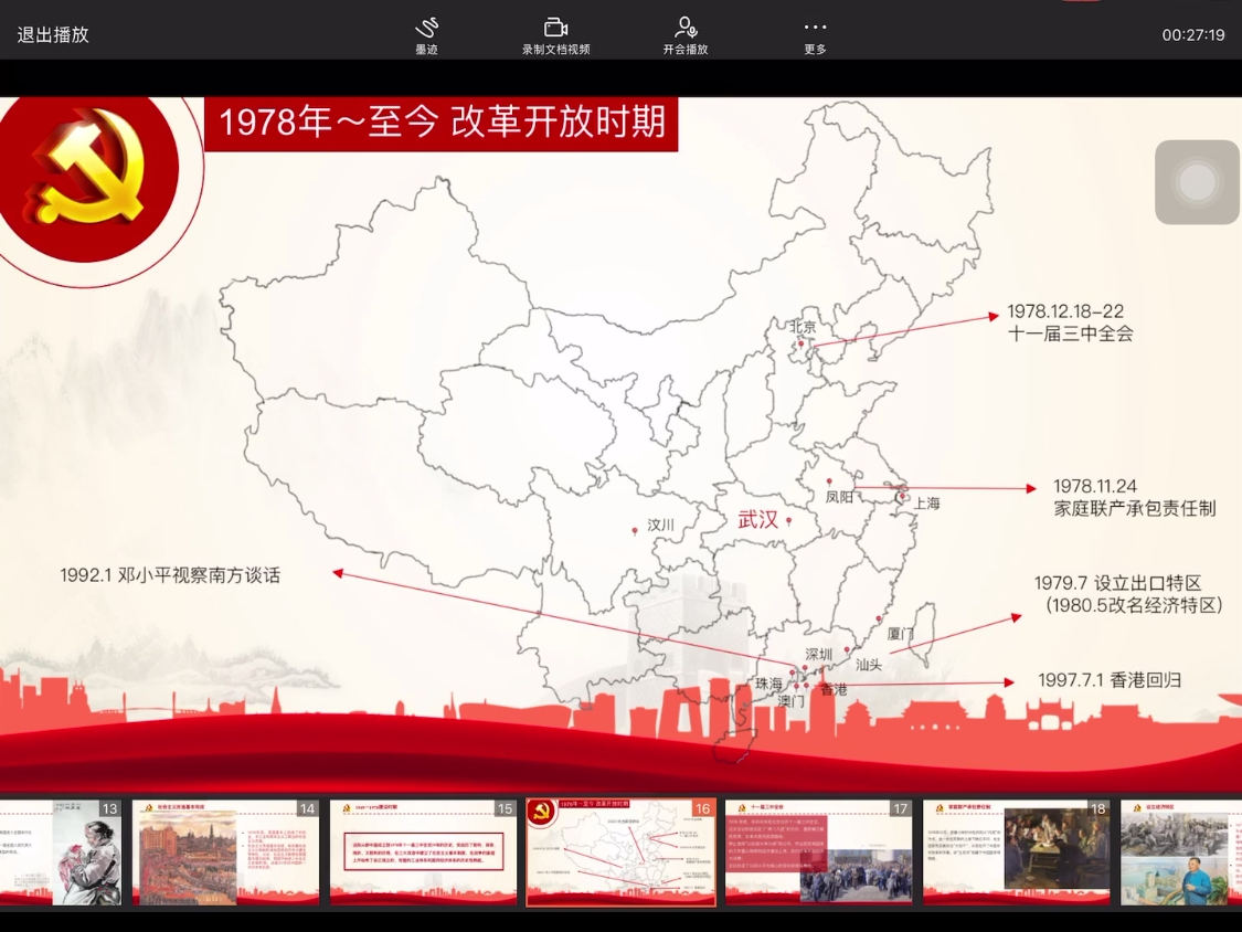 支部委员张家玮、刘旭丽制作了党史地图,学生党员们通过“竞答”方式回顾建党以来的大事件。支部副书记伍子轩带领大家一起重温中共一大、红军长征、改革开放等党的重要历史事件,回望艰苦岁月,牢记党“为人民服务”的宗旨。