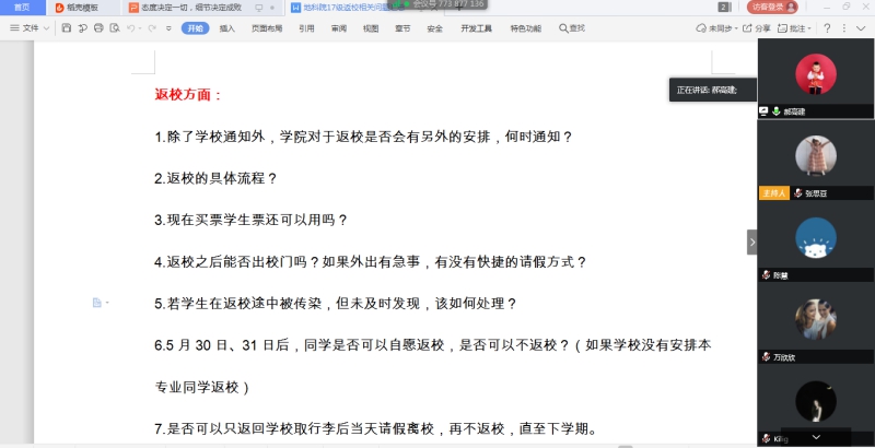 期间,各位老师就学生提出的关于返校时间、请销假等具体问题作了解答说明。最后,郝高建结合返校工作提出了几点要求:一是返校同学要认真学习学校的返校须知,严格按照要求做好返校前、返校中和返校后的各项准备及防护工作,确保身心健康;二是详细了解疫情防控期间相关规定和要求,遵守校纪校规及防疫期间的各项要求;三是要做好个人卫生和宿舍卫生,加强体育锻炼,增强体质;四是严格落实“一日三报”制度,主动做好“错峰就餐”“错峰洗澡”等环节;五是要加强沟通交流,遇到问题第一时间与辅导员及买球网站