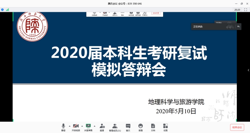 于5月10日下午成功举办2020年考研同学模拟面试云答辩。本次模拟面试答辩分别邀请到来自自然、人文、地信、环境、旅游专业等5位专家教授担任评委,参加复试答辩的70余名同学参加。答辩会由副书记郝高建主持。