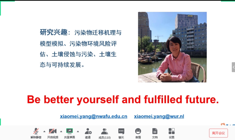 杨晓梅副教授首先回顾了自己在师大环境专业学习的一些趣事,从“我是谁”出发介绍了自己的基本情况,从大学期间的“彷徨与启蒙”阐述了爱好与专业的关系,从纠结到目标的确立。接着结合自己的研究生经历,对自己从事的碳汇、碳储量、碳排放以及IPCC-中国贡献等方面做了介绍,在学习过程中不断发现问题,一直到博士和博士后研究期间最终确定自己的研究方向为农田农药污染物土壤环境行为、塑料污染及其修复。