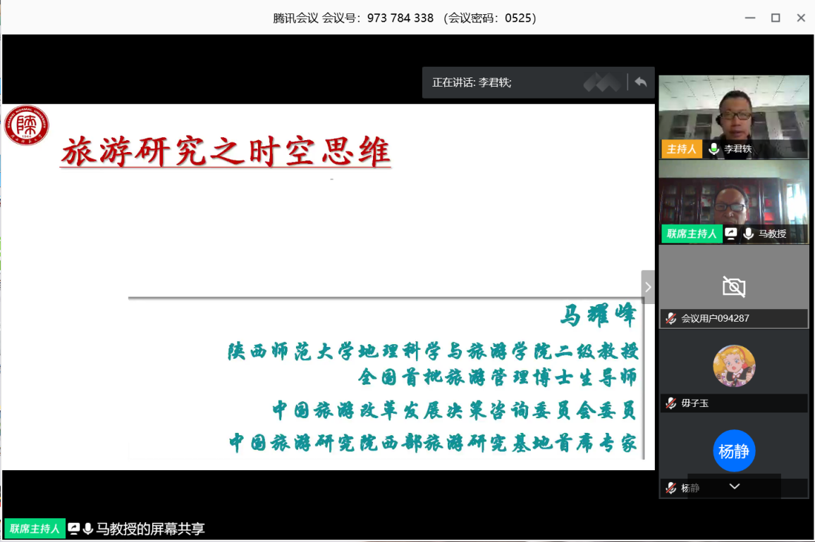 2020年4月14日下午,中国旅游研究院西部旅游研究基地首席专家、陕西师范大学马耀峰教授,围绕思维与时空思维、时空思维旅游研究应用及游客旅游行为模式研究,为买球网站