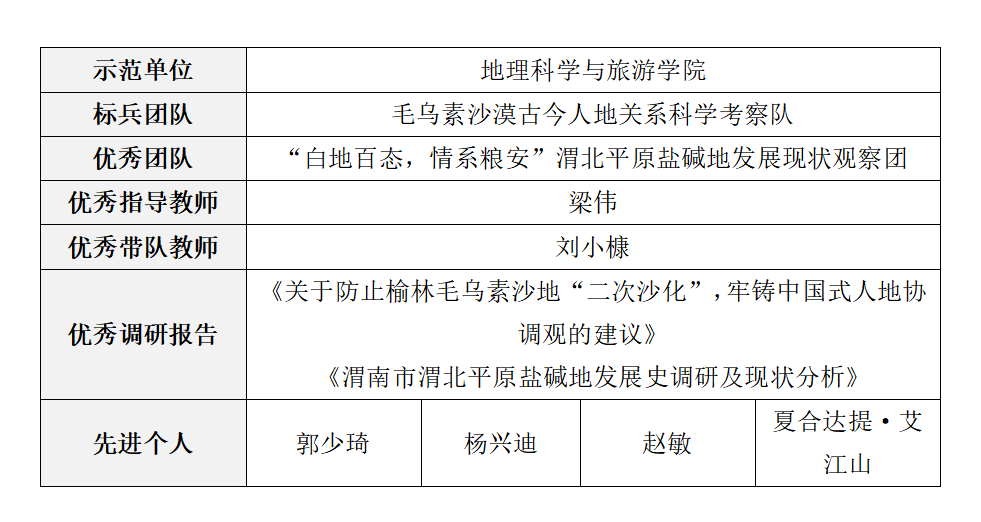 获评陕西师范大学2023年暑期大学生社会实践示范单位称号;毛乌素沙漠古今人地关系科学考察队和“白地百态,情系粮安”渭北平原盐碱地发展现状观察团被评为“标兵团队”和“优秀团队”;梁伟教授和刘小槺副教授分别被评为“优秀指导教师”和“优秀带队教师”,郭少琦等4位同学被评为“先进个人”;《关于防止榆林毛乌素沙地“二次沙化”,牢铸中国式人地协调观的建议》和《渭南市渭北平原盐碱地发展史调研及现状分析》被评为“优秀调研报告”。
