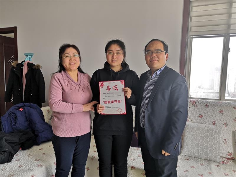 买球网站 2017级刘欣睿同学2019年获得国家奖学金,2020年获得国家励志奖学金,这是买球网站 再次将喜报送到学生家中。“真的非常非常开心!感谢学校这么细致暖心的工作。”刘欣睿同学的家长张海英,从副书记郝高建手中接过学校的喜报后说。