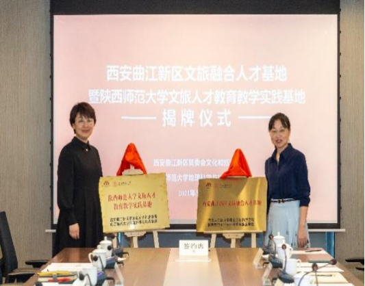 与西安曲江新区管委会文化旅游局在曲江新区管委会签订文旅融合人才基地战略合作框架协议,并进行了“陕西师范大学教育教学实践基地暨曲江文旅融合人才基地”揭牌仪式。曲江党工委委员、管委会副主任李耀杰主持了此次签约与揭牌,文化旅游局局长魏海娜与旅游系系主任白凯教授签署合作协议,并和买球网站