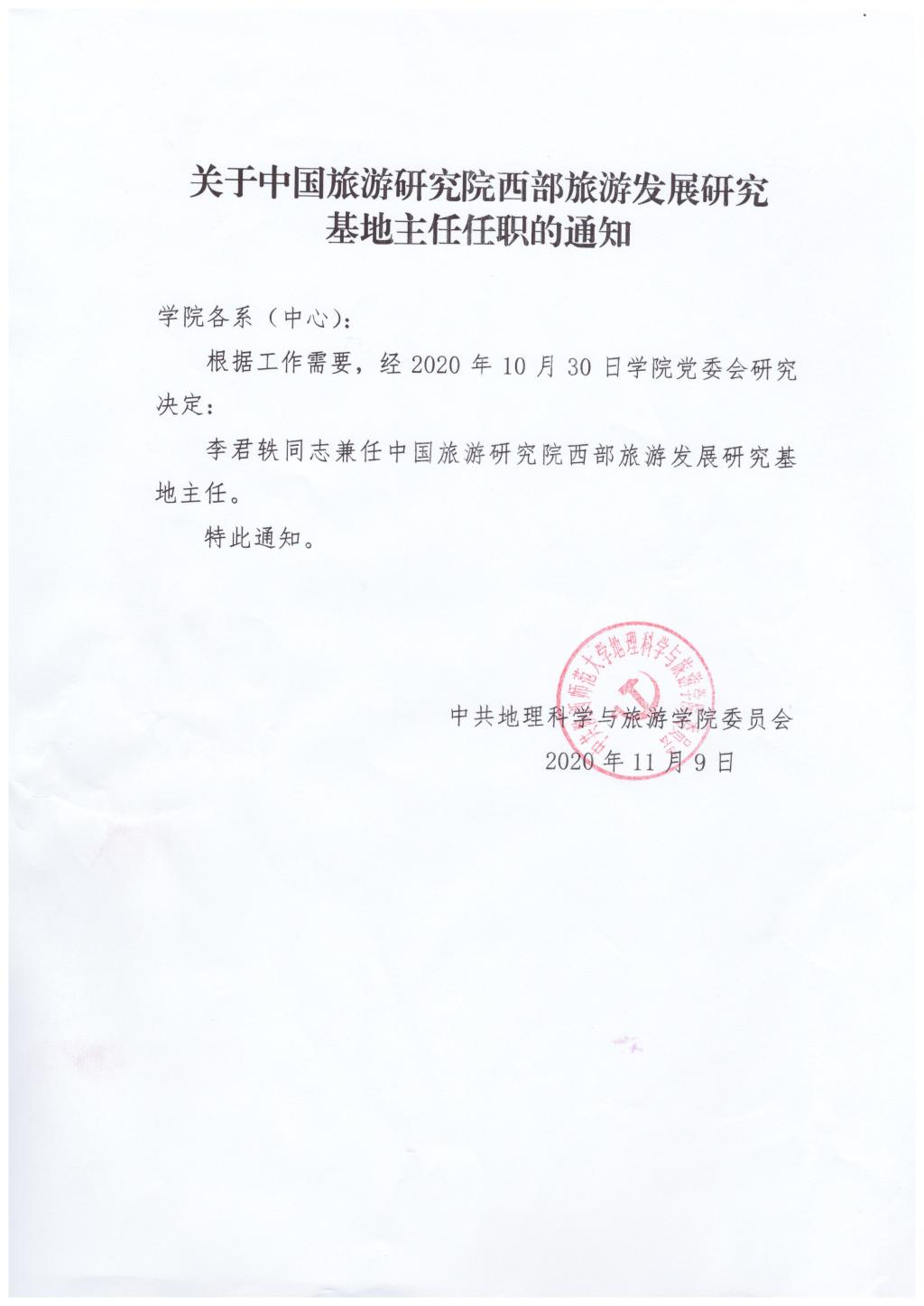 关于中国旅游研究院西部旅游发展研究基地主任任职的通知