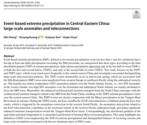 均衡型降水发生与东亚经向波列密切相关,该波列由菲律宾海地区异常冷源激发而来。同时,副热带高压异常西伸,使得更多的水汽输送到中国中东部,引起该区域发生均衡型极端降水事件。分析发现均衡型极端降水事件发生时长江流域表现为明显的相当位温梯度,有利于梅雨锋面的形成。说明均衡性降水事件对应江淮梅雨的发生,也验证了江淮梅雨发生时极端降水分布的均衡性。该研究成果发表在期刊Climate Dynamics上。