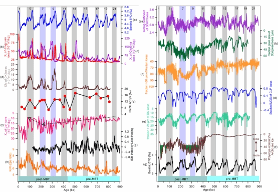 图4 亚洲地区90万年以来降水记录的对比(左)和亚洲地区近地面风强指标与北极海冰以及全球冰量记录的对比(右)
