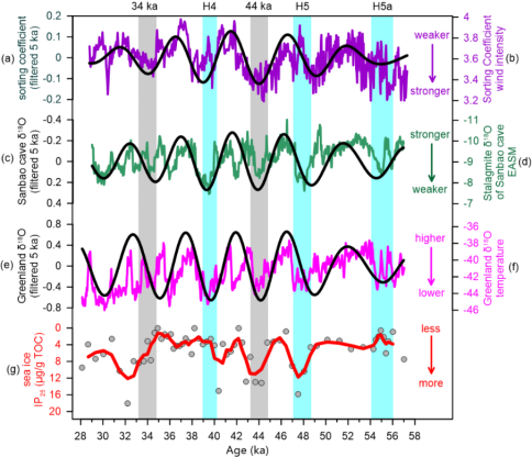 现代观测结果表明,我国西北地区冬春季近地面风强度与西伯利亚高压密切相关。因此,进一步将分选系数用于新疆塔城盆地额敏河河流阶地上一处14 m厚的黄土剖面(图1)当中,重建了末次冰期西伯利亚高压强度的变化。研究发现:(1)不同于平均粒径和粗组分含量指标,分选系数指标表明在北大西洋千年尺度气候事件(Heinrich事件)期间,西伯利亚高压显著增强,并且西伯利亚高压强度大体上以5千年周期波动。(2)进一步与东亚季风区的石笋记录对比,发现更高的分选系数对应更偏负的三宝洞石笋δ18O值,表明末次冰期西伯利亚高压与东亚夏季风强度呈现反相位的变化关系。(3)通过比较千年尺度气候事件的幅度,进一步发现分选系数幅度的变化与北极海冰的幅度变化更相似,支持了北极海冰对西伯利亚高压强度的影响(图2)。