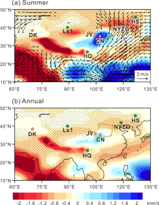 图5 模拟的北半球冰盖的增加对亚洲地区夏季和年降水量的影响