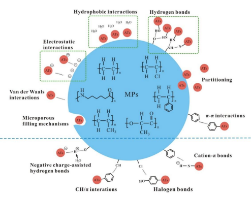 论文概述如下:微塑料与抗生素在在水生环境中普遍共存,不可避免地发生相互作用从而改变环境风险。文章探讨了微塑料和抗生素在全球水生环境中的存在情况,分析了这两者之间的主要吸附机制以及可能参与吸附的机理(下图),讨论了环境因素(pH、离子强度、DOM和矿物)、微塑料理化性质和老化对吸附的影响。微塑料通过吸附抗生素和破坏生物体内抗生素的代谢来增强其生物积累,但水生生物无法摄取的大尺寸微塑料会减少抗生素的生物积累。微塑料在环境中和生物体内吸附抗生素,或两者对同一生物靶点产生作用,会加剧或减缓抗生素的生物毒性。水生环境中的微塑料可富集抗生素抗性基因,其对抗生素抗性基因增殖的影响途径包括促进/抑制抗生素抗性菌的生长、破坏细菌细胞膜、吸附抗生素而增加/减少抗生素与细菌的接触机会。基于当前研究现状,在吸附机制研究、微塑料老化探究、暴露实验条件、微塑料和环境介质选择等方面提出了展望与建议。