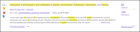 王艳华副教授课题组发表的关于水环境中微塑料与抗生素相互作用(分布、吸附和毒性)的论文入选全球高被引和热点论文。自论文在线发表以来至2023年5月26日被引用80次,被Environmental Science & Technology(11.375),Water Research(13.4), Journal of Hazardous Materials(14.224), Chemical Engineering Journal(16.744), Journal of Cleaner Production(11.072), Applied Clay Science(5.907), Environmental Science-Nano(9.473), Science of the Total Environment(10.753), Critical Review in Environmental Science and Technology(11.75), Environmental Pollution(9.988)等期刊引用。